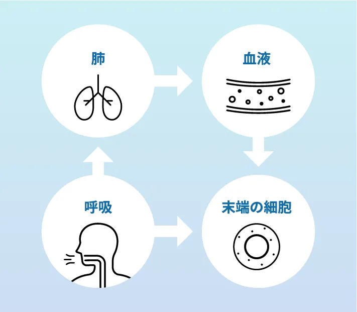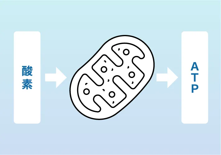 ミトコンドリア内でのATP生成には酸素が使われます。細胞の中にある「ミトコンドリア」が、酸素を使って栄養素を分解し、「ATP(エネルギー物質)」を作り出します。ATPは細胞の活動エネルギーとなり、修復や再生、新陳代謝をスムーズに行えるようにします。また、酸素は血流を促進し、老廃物の排出を助ける働きもあります。※ミトコンドリア内でのATP生成には酸素が使われます