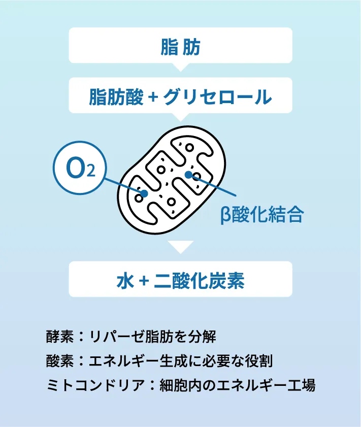 体内では、リパーゼという酵素のはたらきにより、脂肪(中性脂肪)が分解され、代謝の過程でエネルギーとして活用されます。このとき、酸素は代謝プロセスに関与し、分解された脂肪酸は最終的にミトコンドリア内で酸素とともにエネルギー(ATP)に変換されます。これは、運動時や日常活動でエネルギーを生み出す生理的なしくみとして知られています。※この説明は一般的な代謝に関する情報であり、特定の製品の効果効能を示すものではありません。