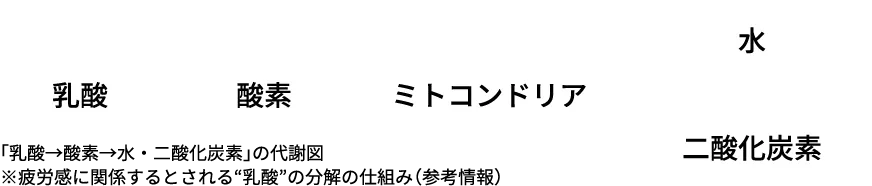運動で筋肉に「乳酸」がたまり疲労が生じますが、酸素が十分に供給されると乳酸は分解され、水と二酸化炭素となって体外へ排出されます。※右図は、酸素の働きのイメージ図であり、効果効能を保証するものではありません。
