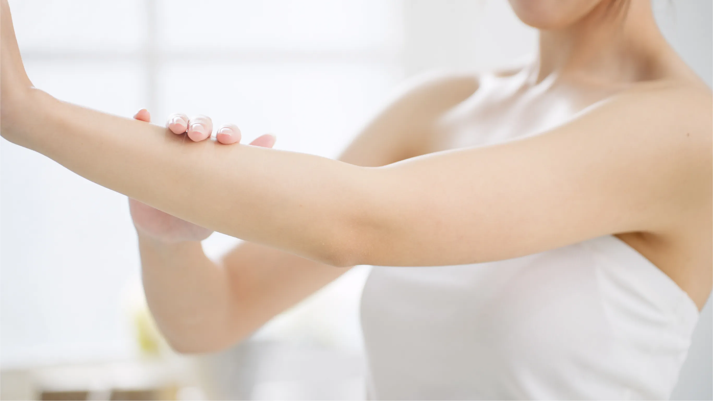 鎖骨周辺、肩先、腕の外側、脇の下から肘にかけてよく馴染ませます。