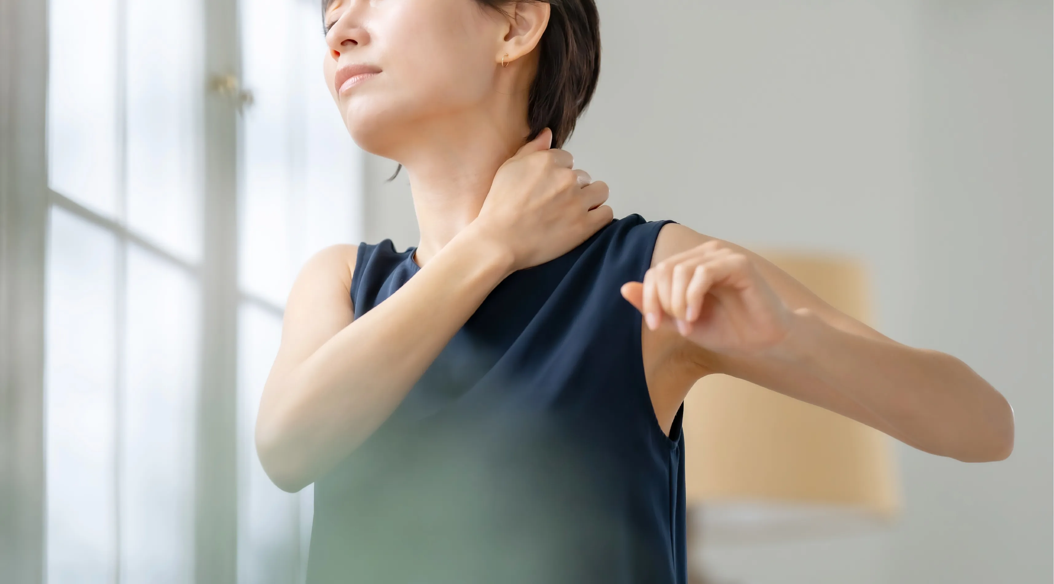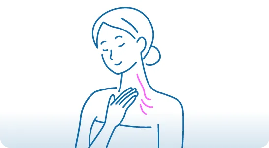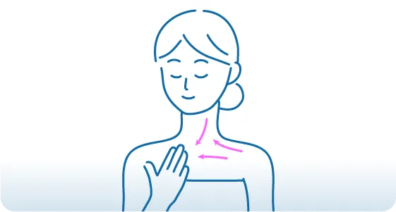 人最指と中指で挟みこみながらオイルをよく馴染ませます。指の腹を使って肩先から鎖骨の中央に向かって、優しく流すと効果的です。
