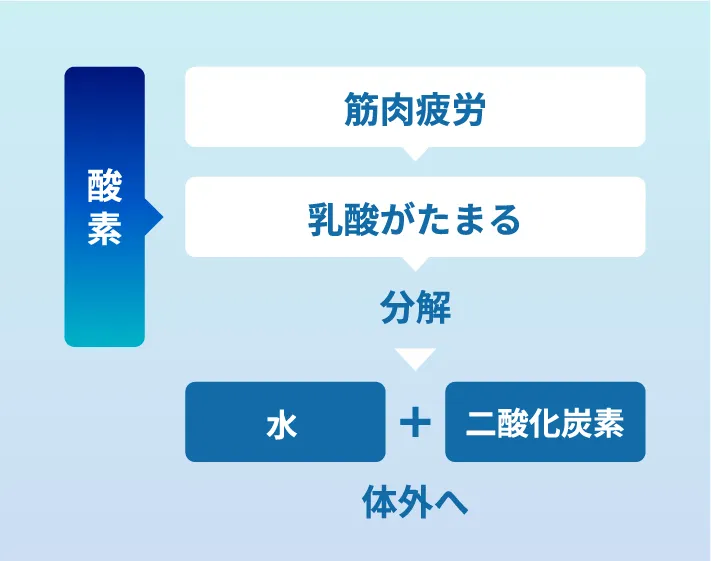 運動で筋肉に「乳酸」がたまり疲労が生じますが、酸素が十分に供給されると乳酸は分解され、水と二酸化炭素となって体外へ排出されます。※右図は、酸素の働きのイメージ図であり、効果効能を保証するものではありません。